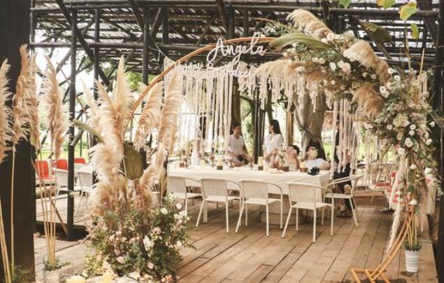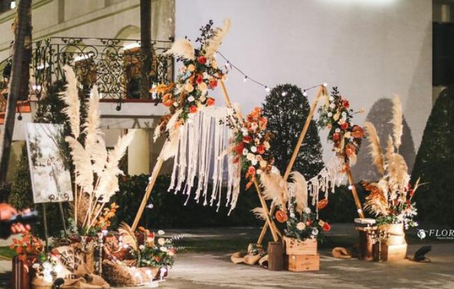 戶外佈置-充滿個性的復古橘,加上些許白色突顯層次,隨風搖曳的編織繩和蘆葦,配上各式古董道具,浪漫又獨特