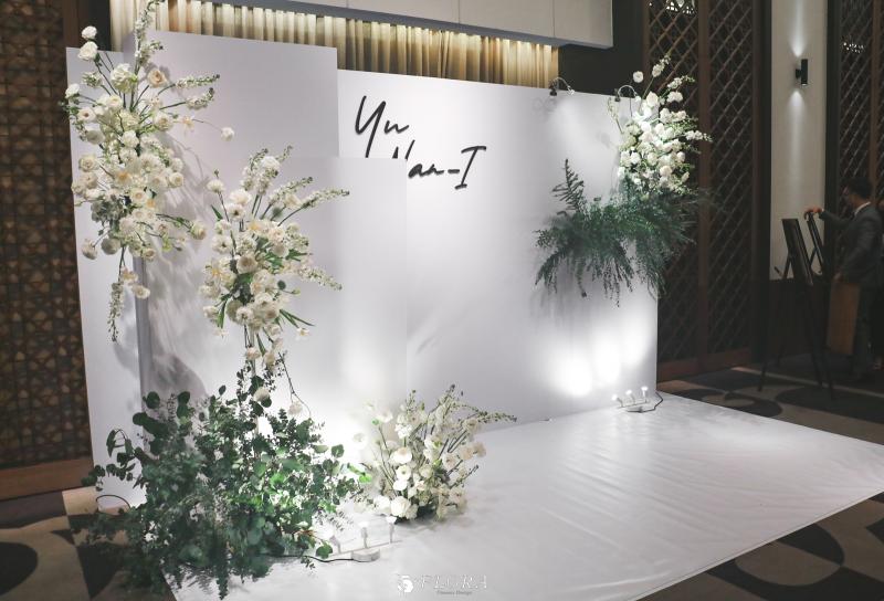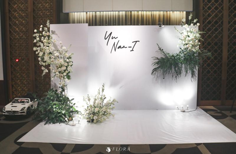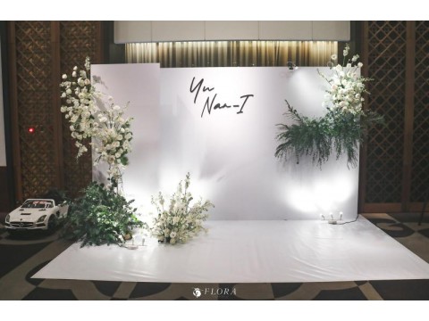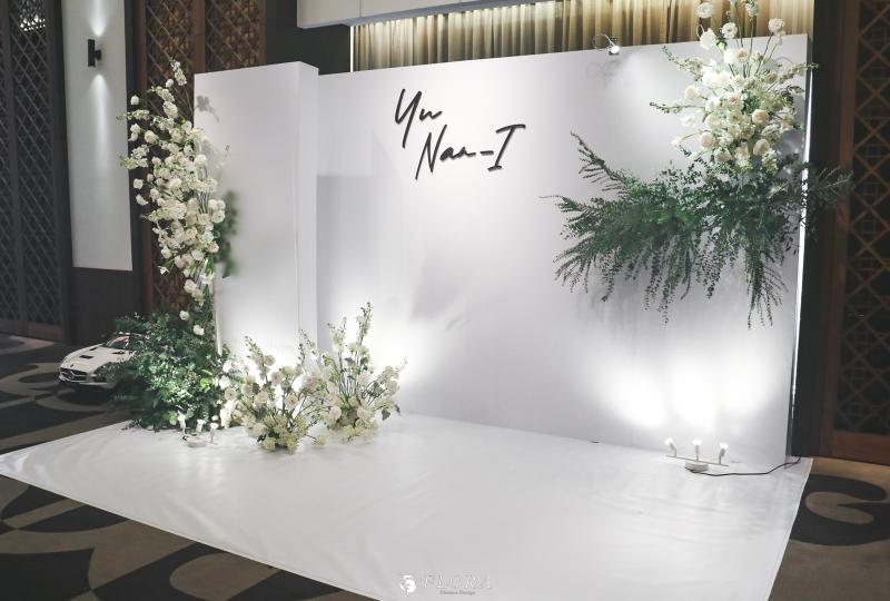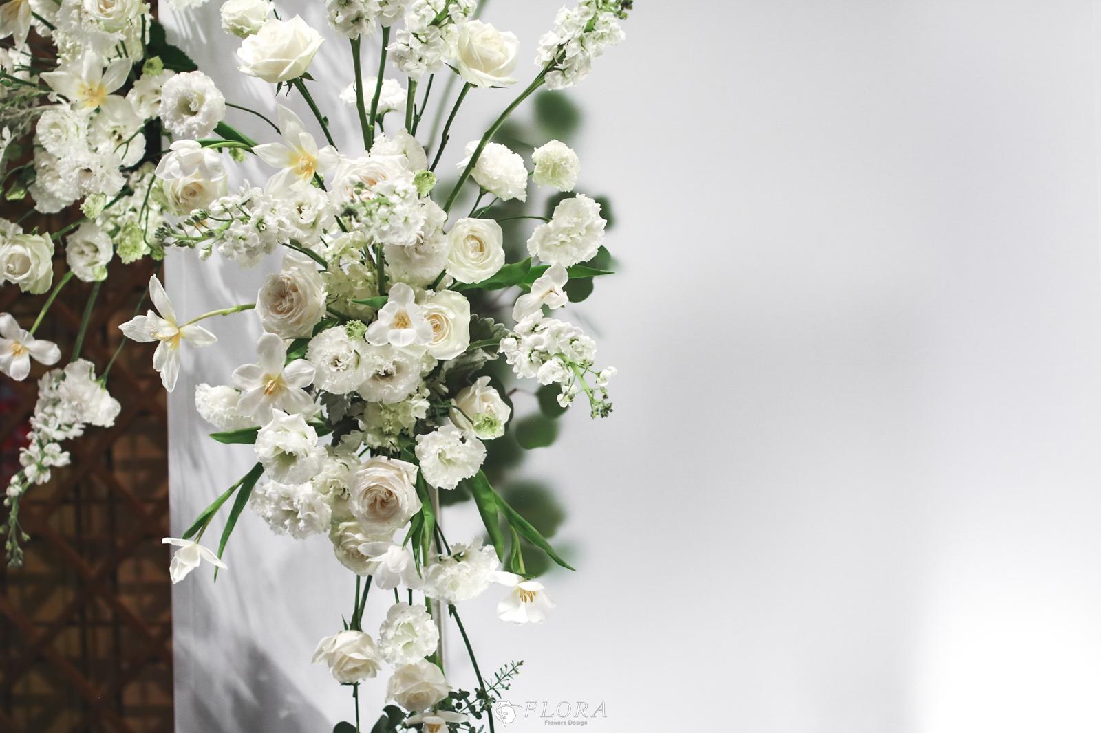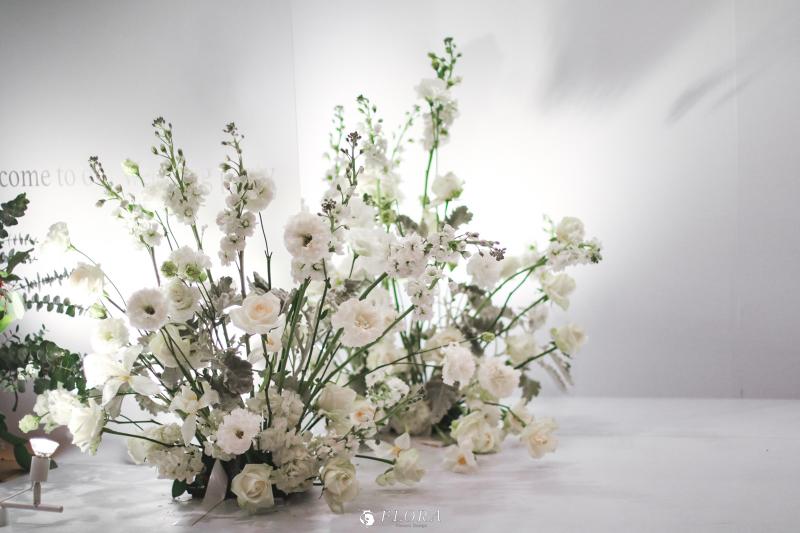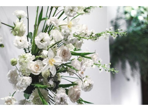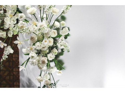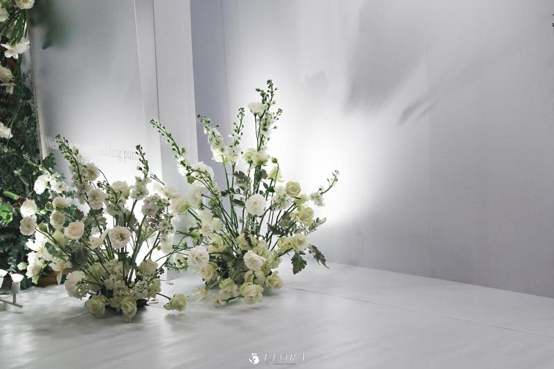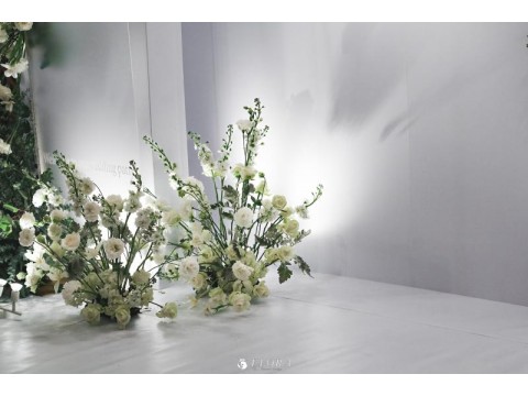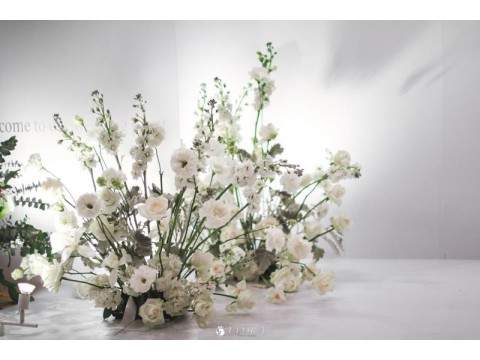 滿滿的白綠色系花材,像瀑布般的自背板上流淌而下,奔放的線條,化成了在空氣中跳躍的白色精靈。