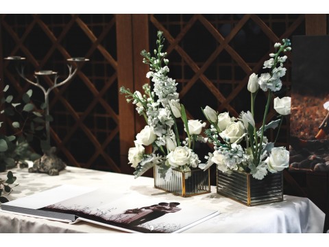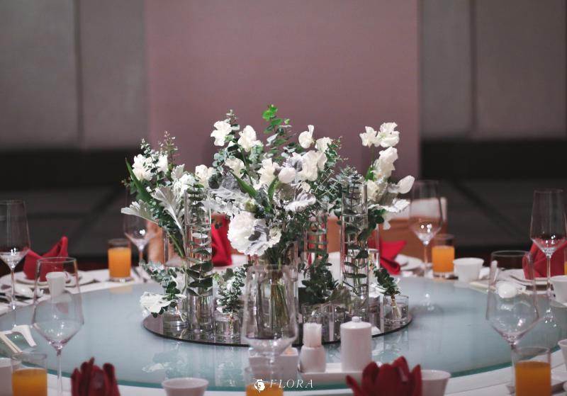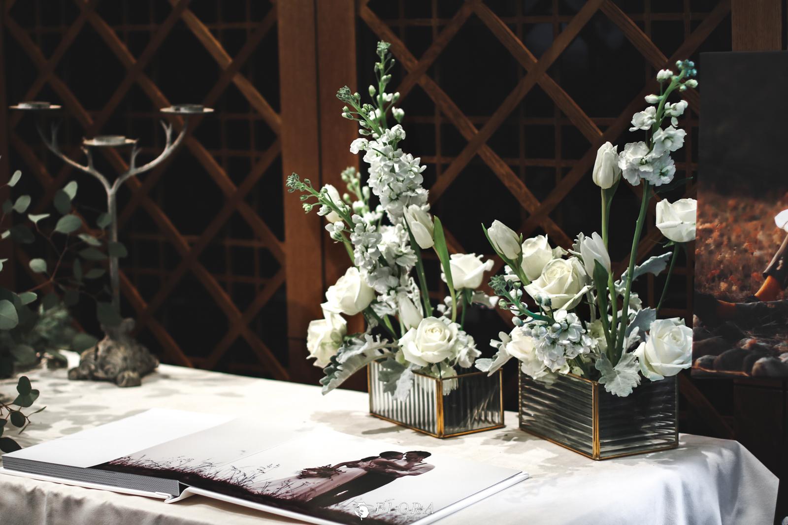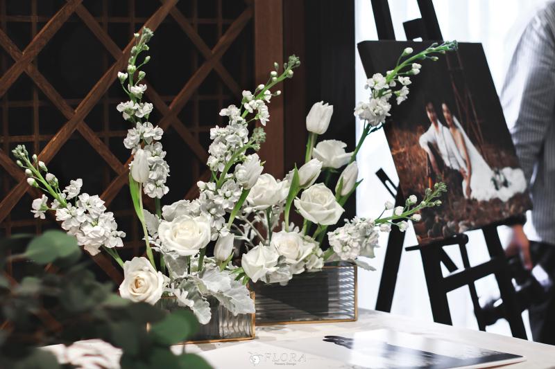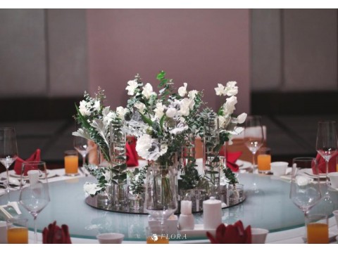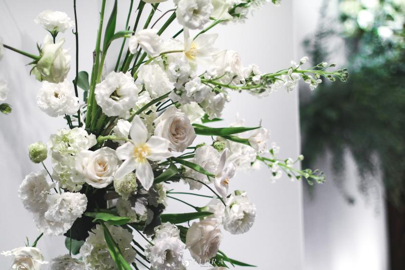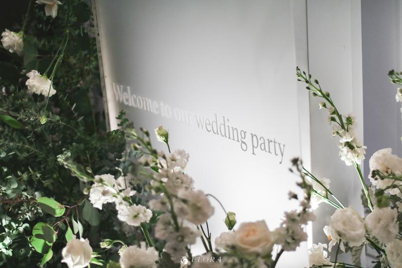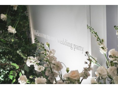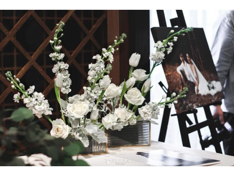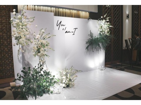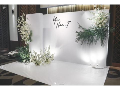 滿滿的白綠色系花材,像瀑布般的自背板上流淌而下,奔放的線條,化成了在空氣中跳躍的白色精靈。