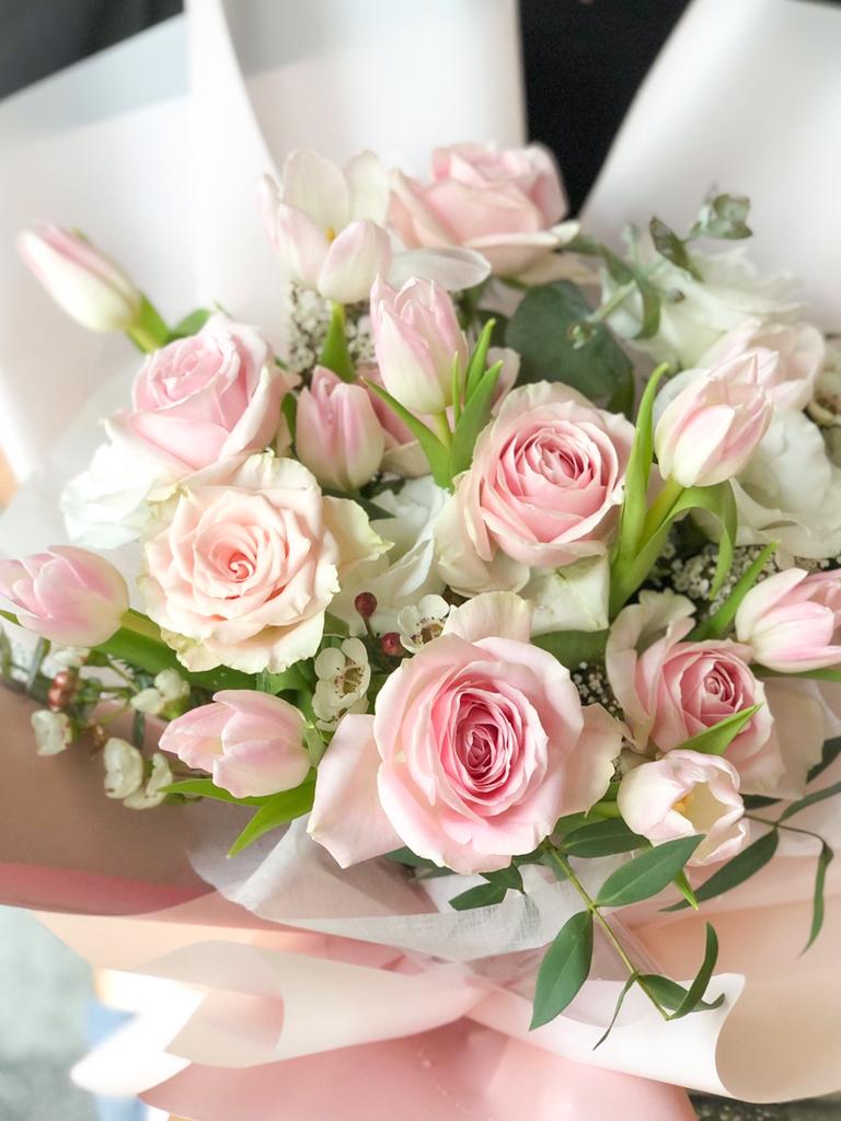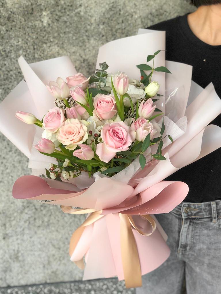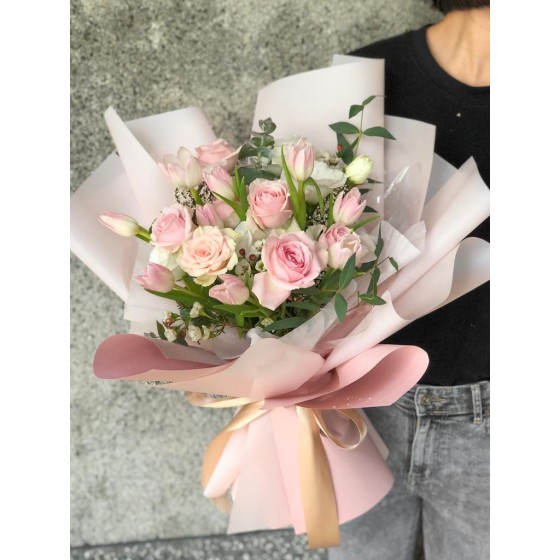 商品須知: 尺 寸:高約45x寬約40公分 (手作商品,可能會有約正負5公分的誤差) 花 材:玫瑰、鬱金香、當季葉材及配花 注意事項: 花束最佳觀賞期為3-5天,會因擺放位置溫度、濕度等各類因素影響擺放天數。建議擺放於陰涼通風處,並注意水分補充。 花材為天然植物,會因氣候的變化而產生不同的色澤,顏色也會有些許差異性,如遇花材缺貨,請同意花藝設計師更換類似花材。 附加服務:商品皆可提供小卡、花束商品提供紙袋。