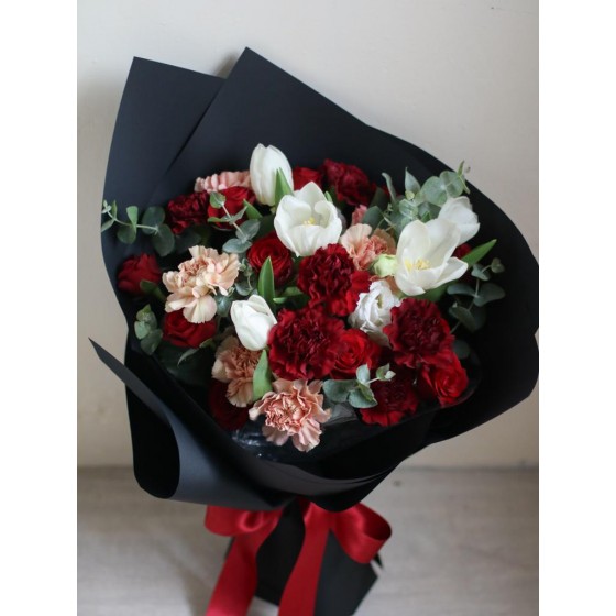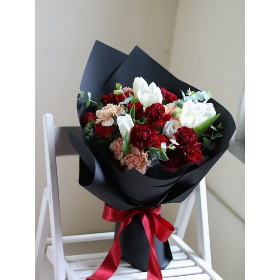 商品須知: 尺 寸:高約45x寬約35公分 (手作商品,可能會有約正負5公分的誤差) 花 材:玫瑰、進口康乃馨、鬱金香、當季葉材及配花 注意事項: 花束最佳觀賞期為3-5天,會因擺放位置溫度、濕度等各類因素影響擺放天數。建議擺放於陰涼通風處,並注意水分補充。 花材為天然植物,會因氣候的變化而產生不同的色澤,顏色也會有些許差異性,如遇花材缺貨,請同意花藝設計師更換類似花材。 附加服務:商品皆可提供小卡、花束商品提供紙袋。