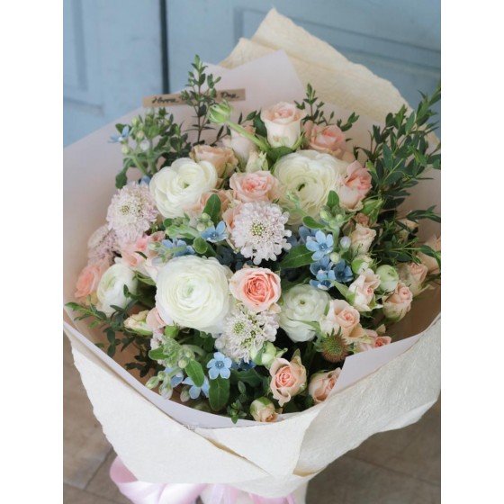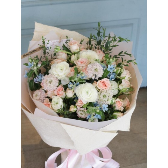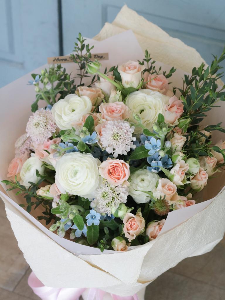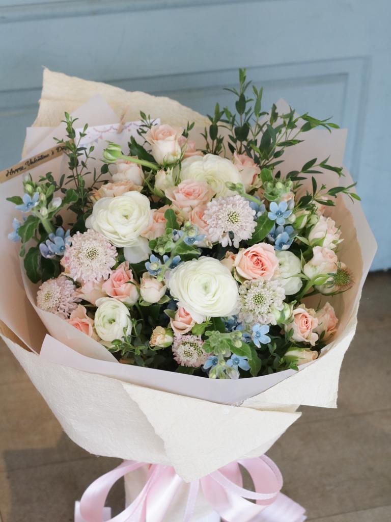商品須知: 尺 寸:高約40x寬約30公分 (手作商品,可能會有約正負5公分的誤差) 花 材:玫瑰、陸蓮、藍星花、當季葉材及配花 注意事項: 花束最佳觀賞期為3-5天,會因擺放位置溫度、濕度等各類因素影響擺放天數。建議擺放於陰涼通風處,並注意水分補充。 花材為天然植物,會因氣候的變化而產生不同的色澤,顏色也會有些許差異性,如遇花材缺貨,請同意花藝設計師更換類似花材。 附加服務:商品皆可提供小卡、花束商品提供紙袋。