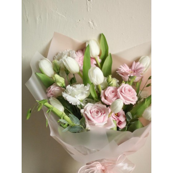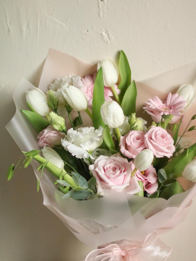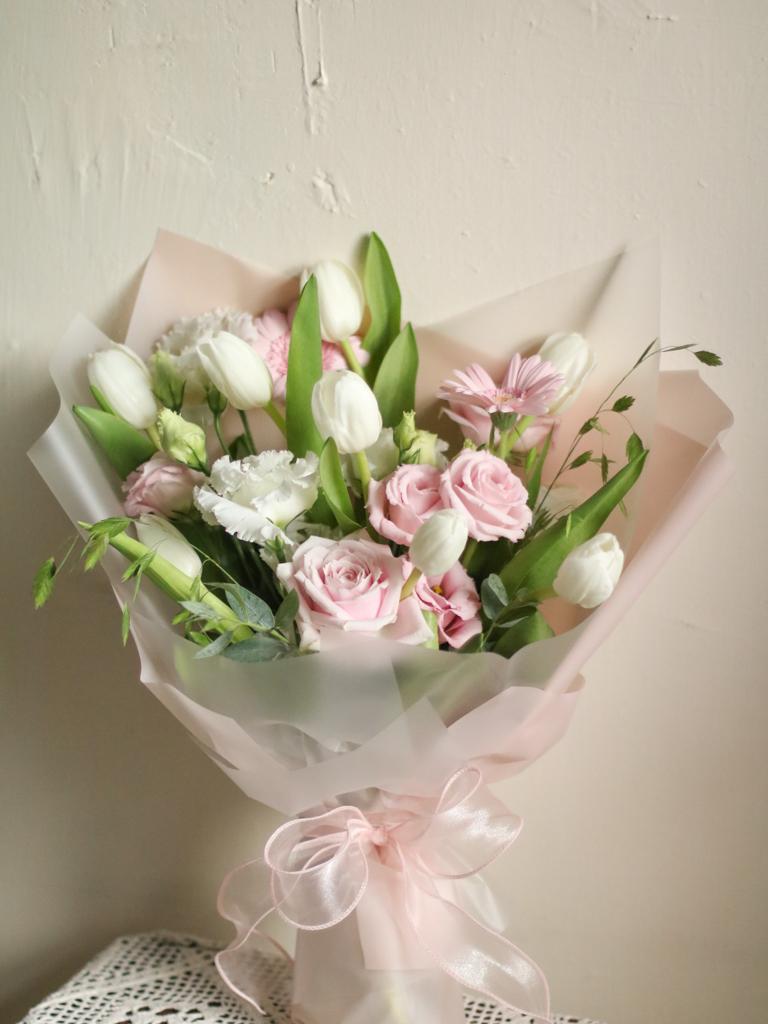 花 材:玫瑰、鬱金香、太陽花、當季葉材及配花