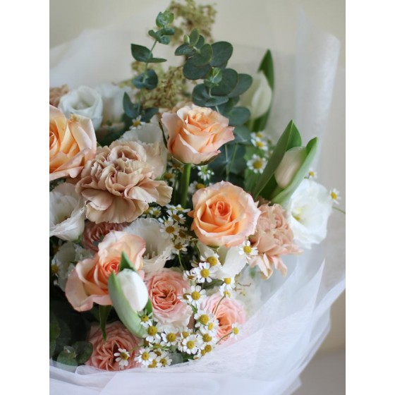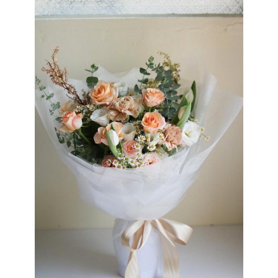 花 材:玫瑰、鬱金香、進口康乃馨、洋甘菊、當季葉材及配花
