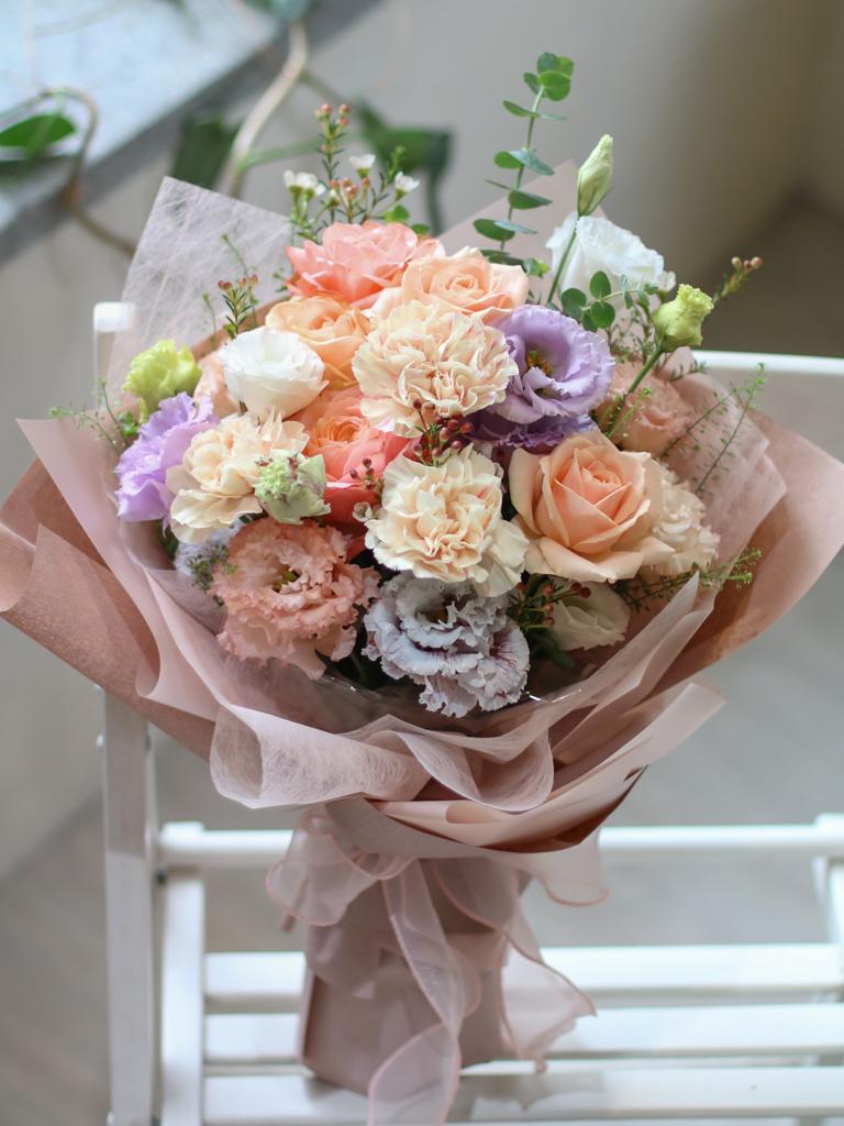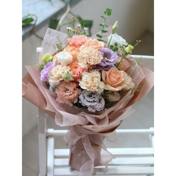 花 材:玫瑰、進口康乃馨、桔梗、當季葉材及配花