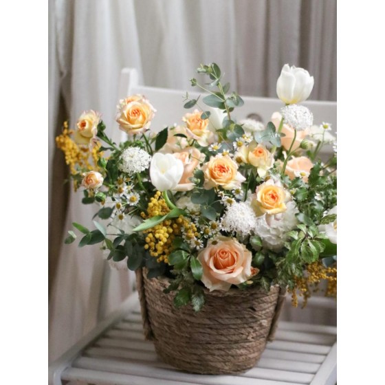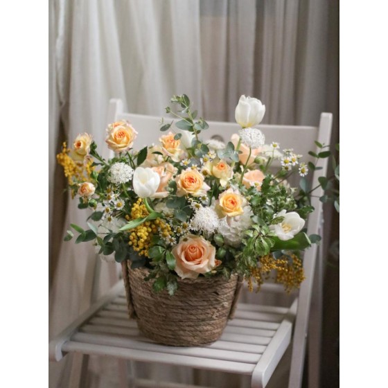 花 材:鬱金香、玫瑰、洋甘菊、金合歡(季節限定)、當季葉材及配花