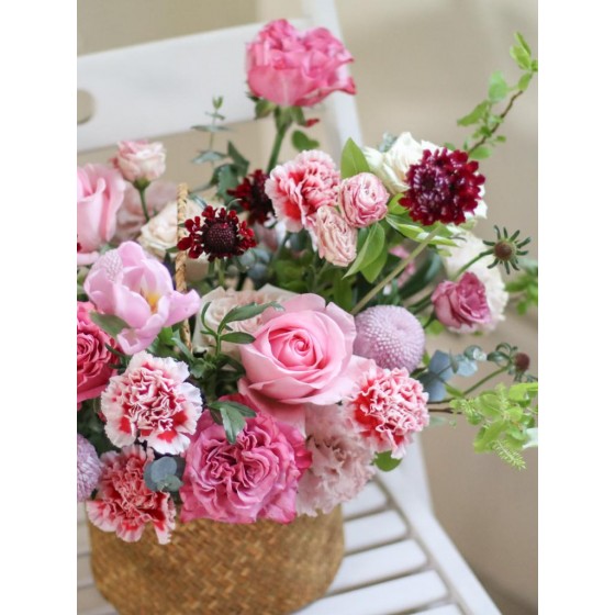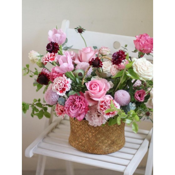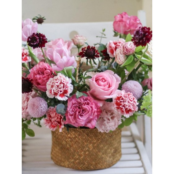 花 材:進口康乃馨、鬱金香、玫瑰、乒乓菊、松蟲、當季葉材及配花