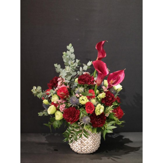 花 材:進口康乃馨、玫瑰、薊花、海芋、當季葉材及配花