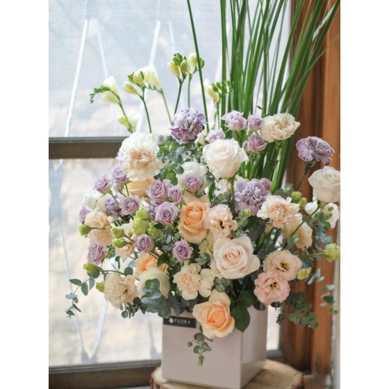 花 材:進口康乃馨、桔梗、玫瑰、小蒼蘭、當季葉材及配花