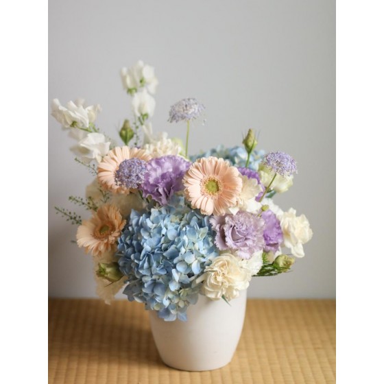 花 材:繡球、桔梗、太陽花、松蟲、香碗豆(季節限定)、當季葉材及配花