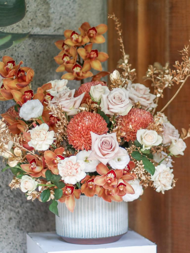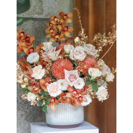花材為天然植物,會因氣候的變化而產生不同的色澤,顏色也會有些許差異性,如遇花材或花器缺貨,請同意花藝設計師更換類似花材及花器。