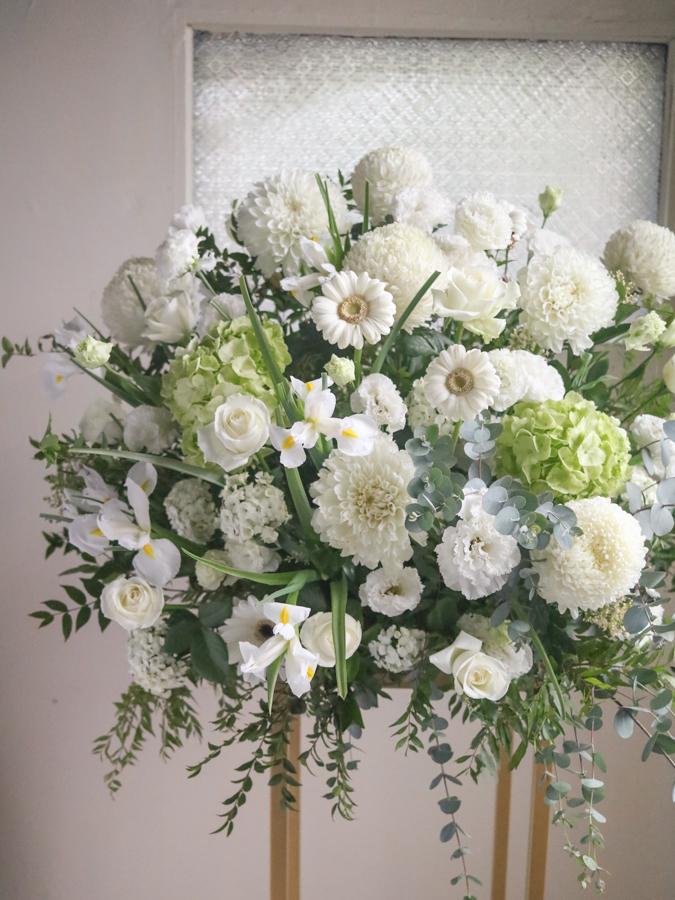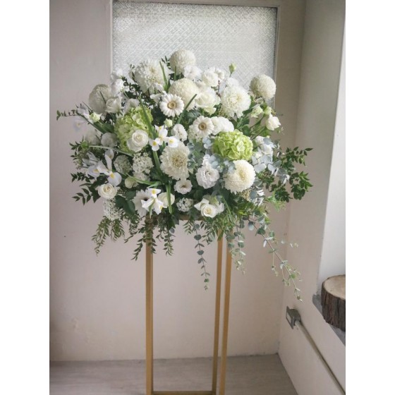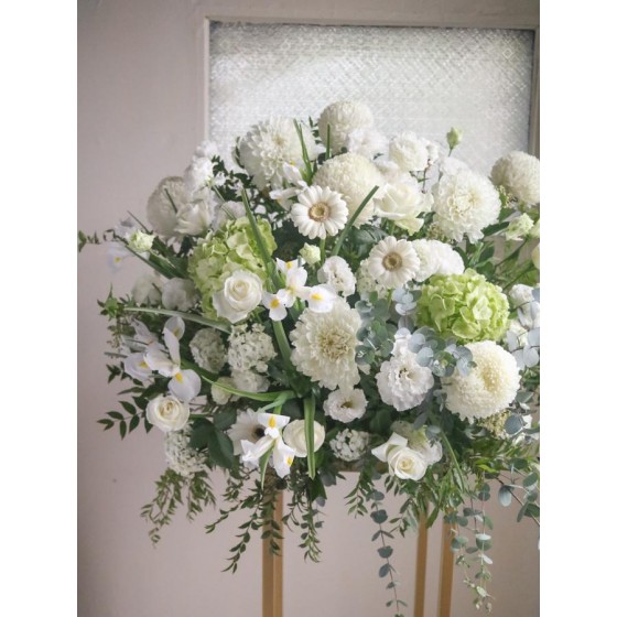 花 材:大理花、繡球、鳶尾花(季節限定)、牡丹菊、太陽花、桔梗、當季葉材及配花