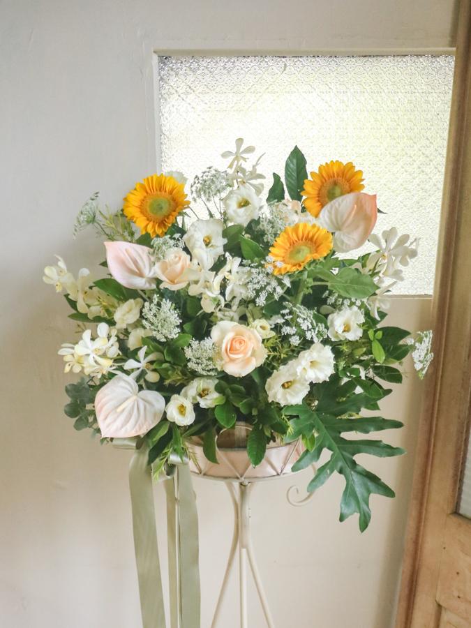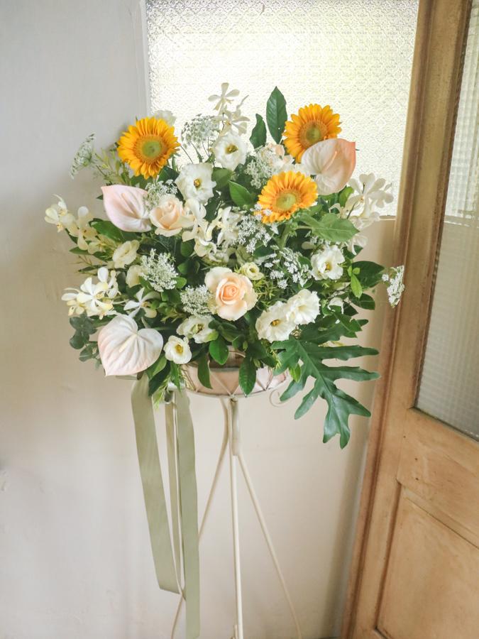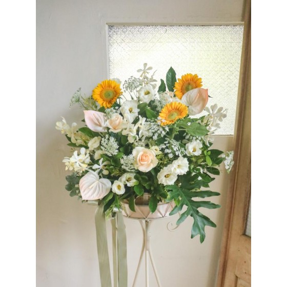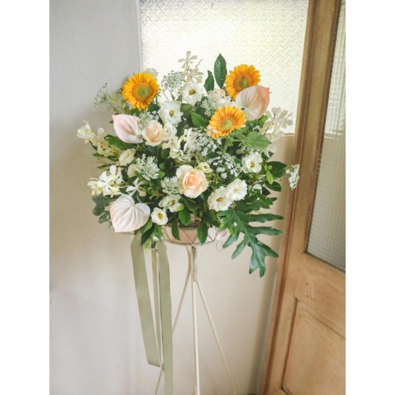 花 材:玫瑰、向日葵、桔梗、蕾絲花、火鶴、千代蘭、當季葉材及配花