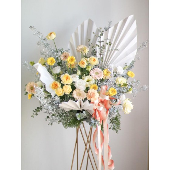 花 材:玫瑰、太陽花、康乃馨、桔梗、當季葉材及配花、造型紙扇
