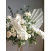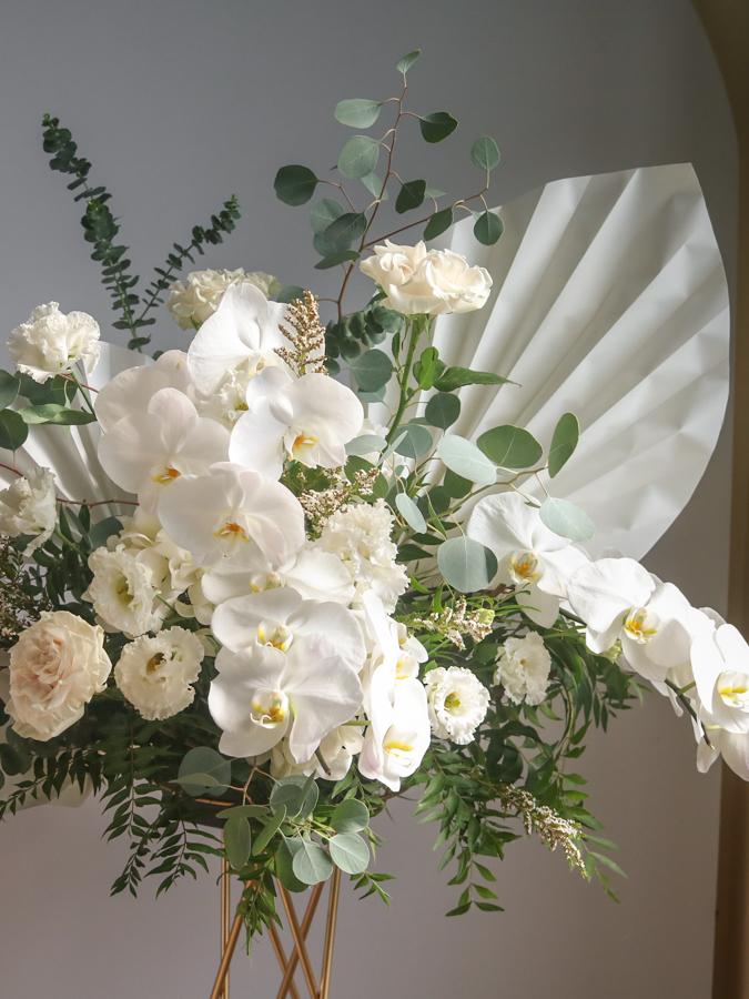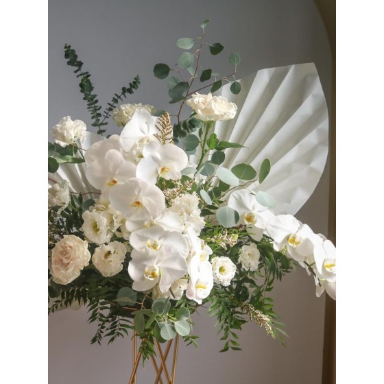 花 材:玫瑰、蝴蝶蘭、桔梗、當季葉材及配花、造型紙扇