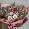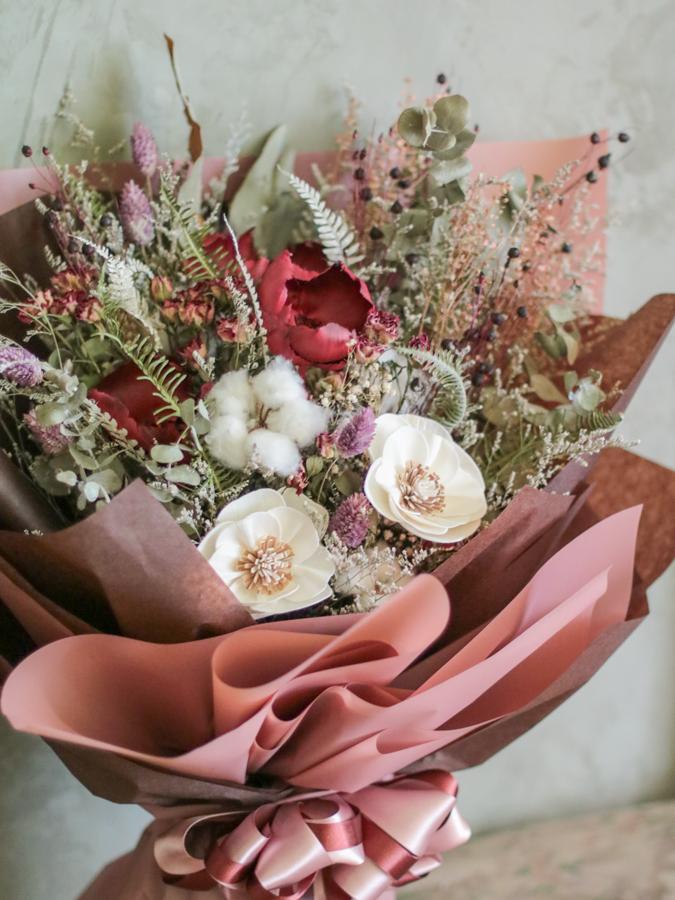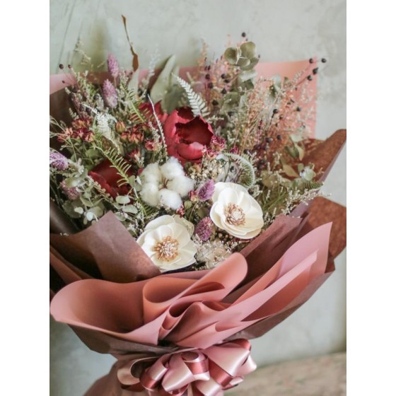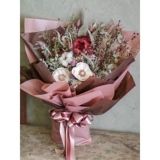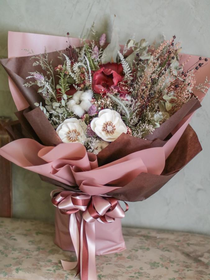商品須知: 尺 寸:高約40x寬約35公分 (手作商品,可能會有約正負3公分的誤差) 花 材:蓪草花、乾燥花材及葉材 注意事項: 永生花及乾燥花若保存得當可擺放約2-3年,但仍會因擺放位置溫度、濕度等各類因素影響擺放年限。建議放置於陰涼乾燥處,請勿直射陽光以免花材褪色。 永生花及乾燥花會因製作批次的不同而產生不同的色差,大小也會有些許差異性,如遇花材及資材缺貨,請同意花藝設計師更換類似花材及資材。 附加服務:商品皆可提供花卡。