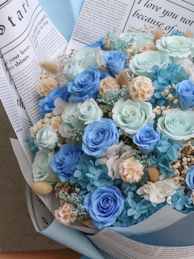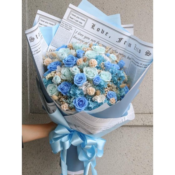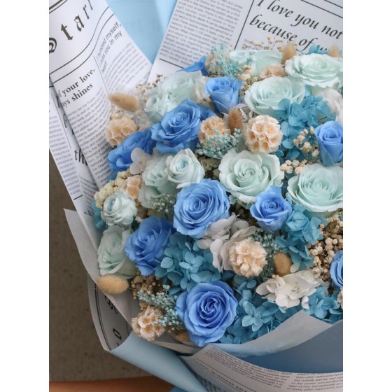永生花及乾燥花會因製作批次的不同而產生不同的色差,大小也會有些許差異性,如遇花材及資材缺貨,請同意花藝設計師更換類似花材及資材。