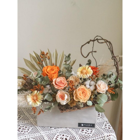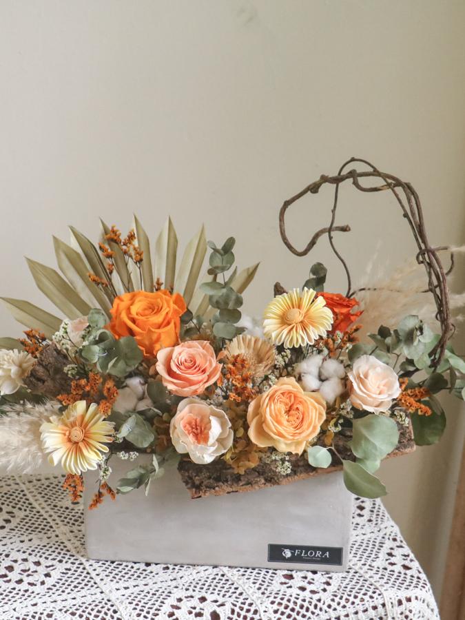 商品須知: 尺 寸:高約25x寬約30公分(手作商品,可能會有約正負3公分的誤差) 花 材:永生花材、蓪草花、乾燥花材及葉材 注意事項: 永生花及乾燥花若保存得當可擺放約2-3年,但仍會因擺放位置溫度、濕度等各類因素影響擺放年限。建議放置於陰涼乾燥處,請勿直射陽光以免花材褪色。 永生花及乾燥花會因製作批次的不同而產生不同的色差,大小也會有些許差異性,如遇花材及資材缺貨,請同意花藝設計師更換類似花材及資材。 附加服務:商品皆可提供花卡。