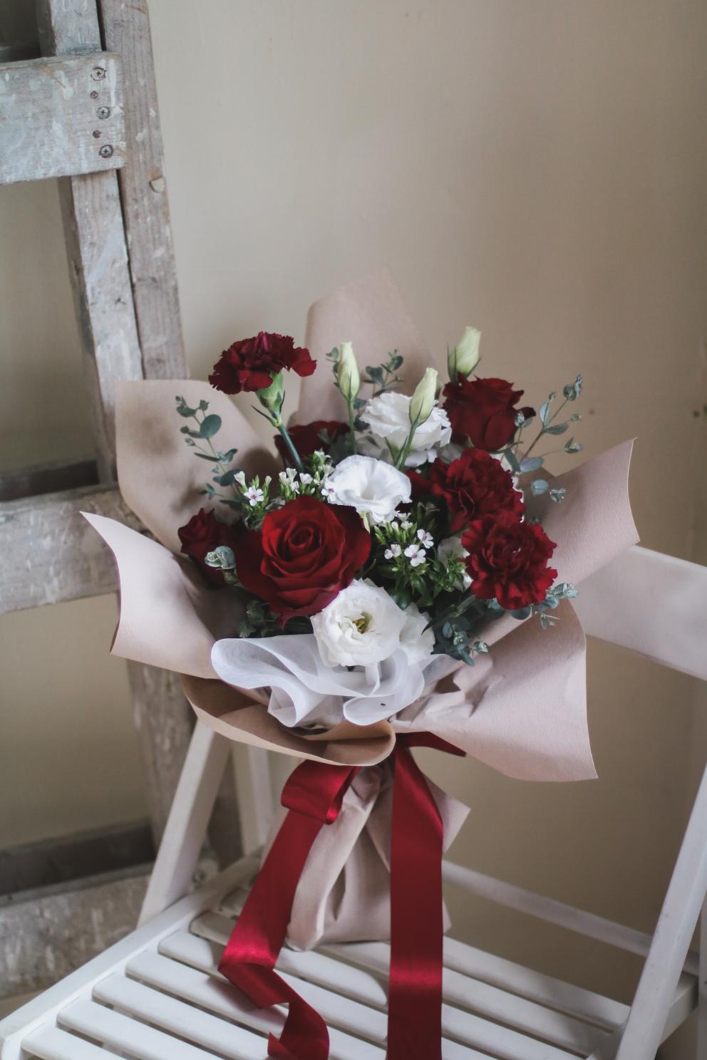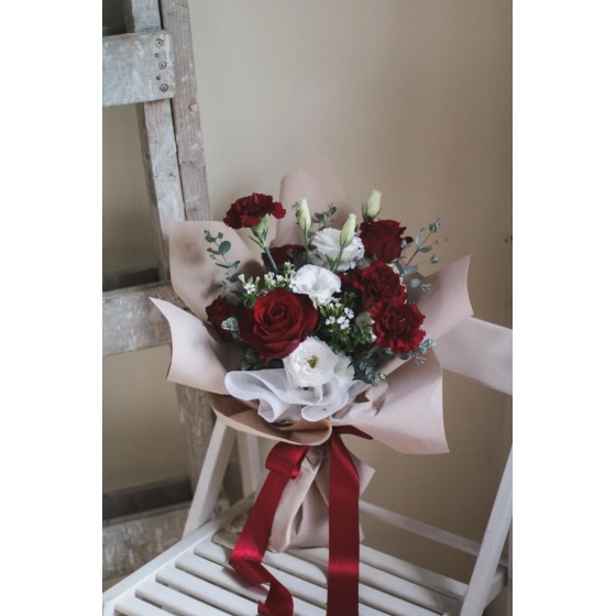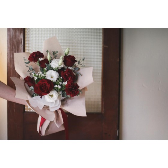 花 材:玫瑰、深山櫻、進口康乃馨、當季葉材及配花