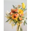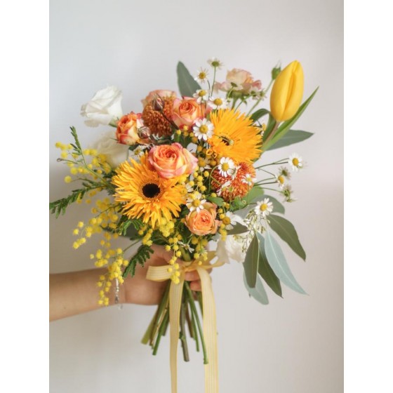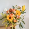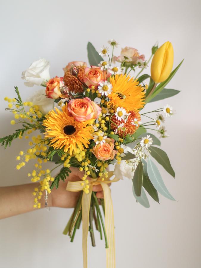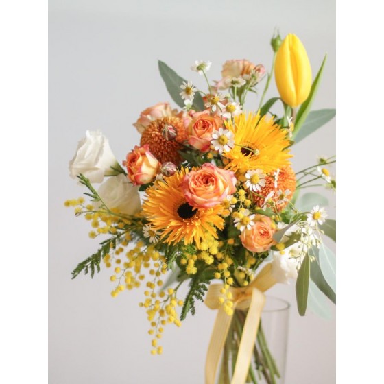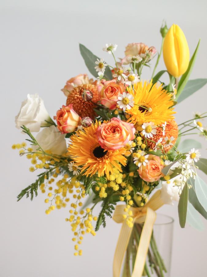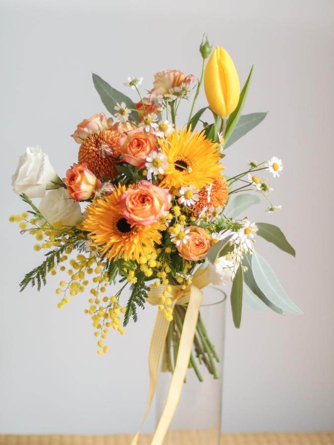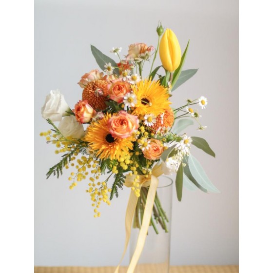 花 材:迷你玫瑰、太陽花、鬱金香、金合歡(季節限定)、當季葉材及配花
