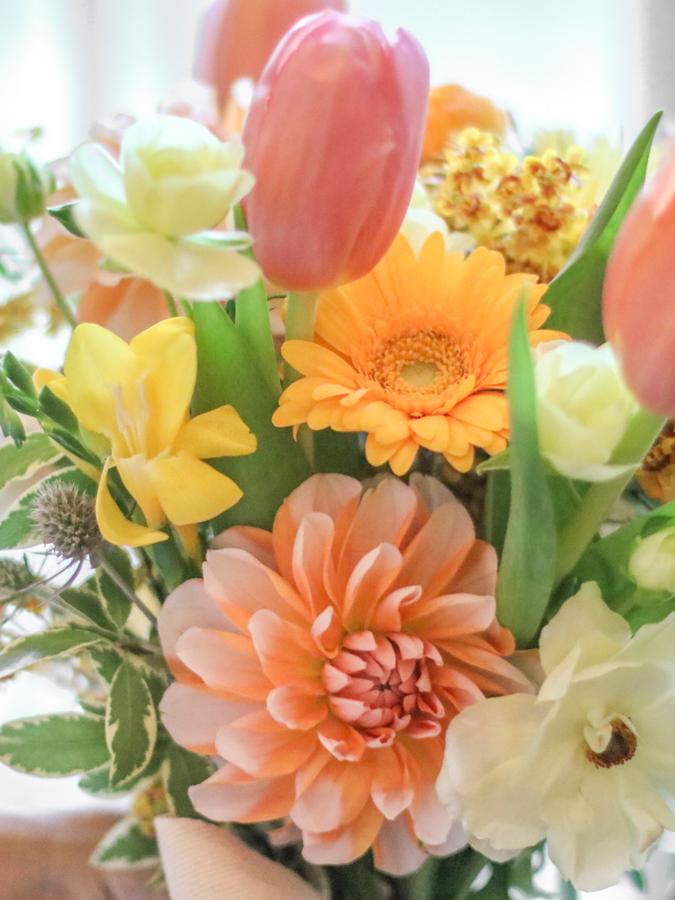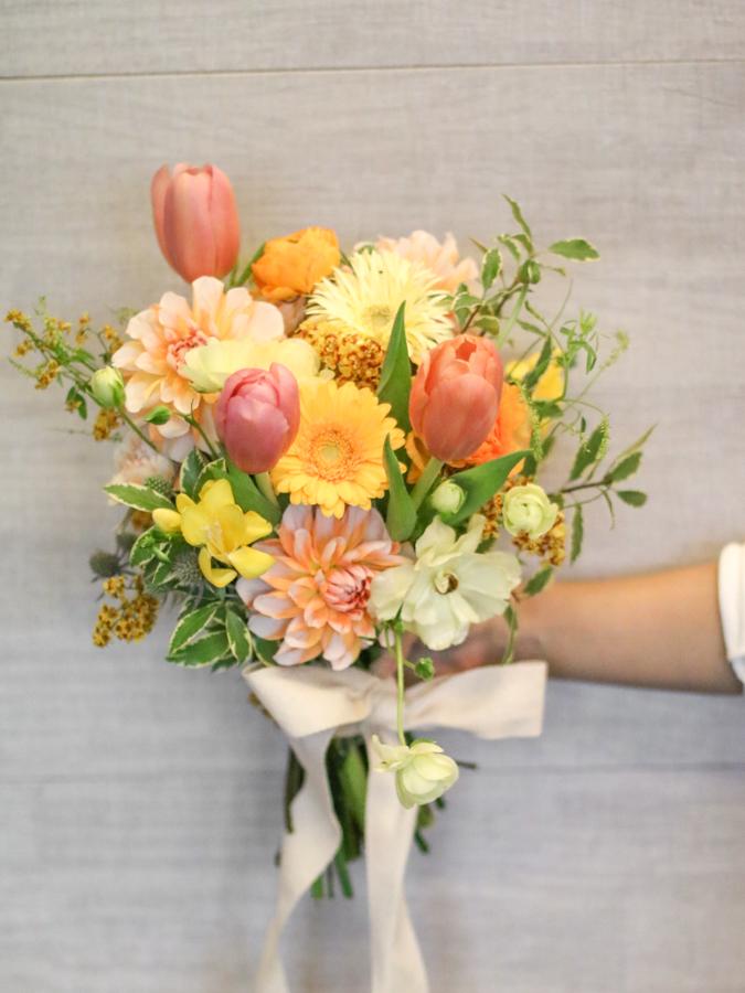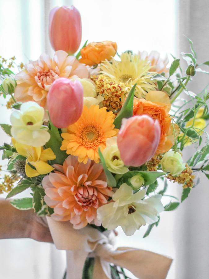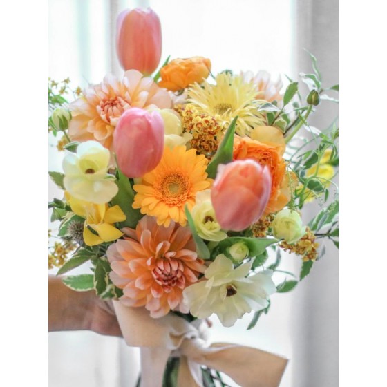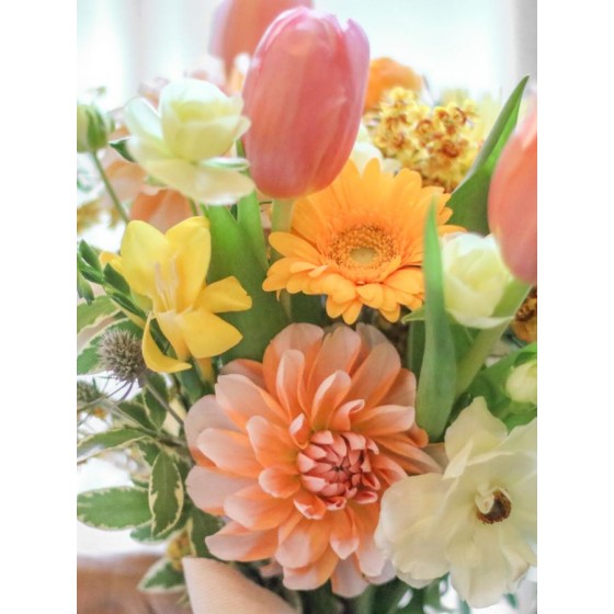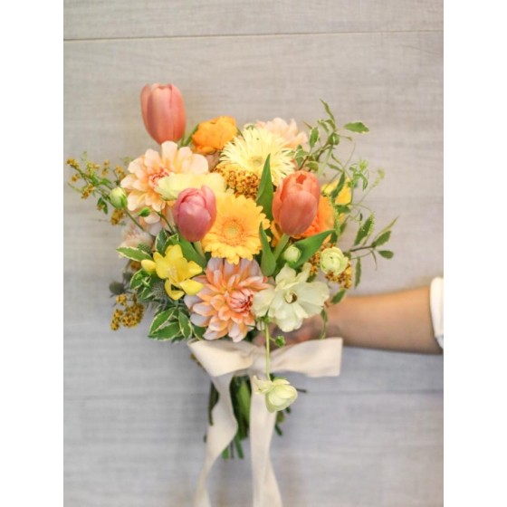 花 材:大理花、鬱金香、陸蓮、太陽花、當季葉材及配花