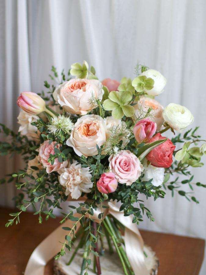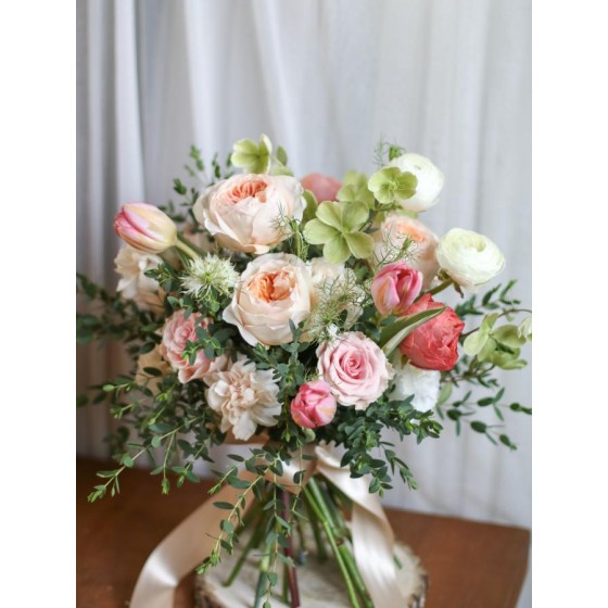 花 材:玫瑰、鬱金香、陸蓮、康乃馨、當季葉材及配花