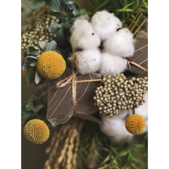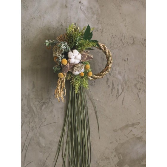 花 材:艾草、菖蒲、芙蓉、榕樹葉、棉花、金杖球、當季葉材及配花