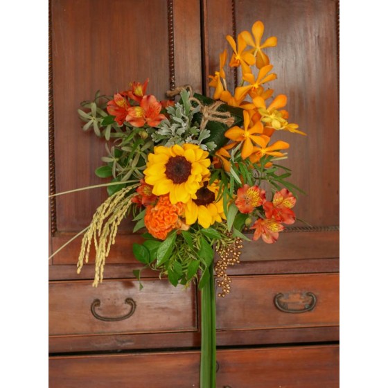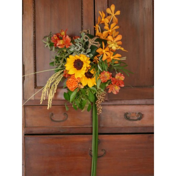 花 材:艾草、菖蒲、芙蓉、榕樹葉、向日葵、雞冠花、千代蘭、當季葉材及配花