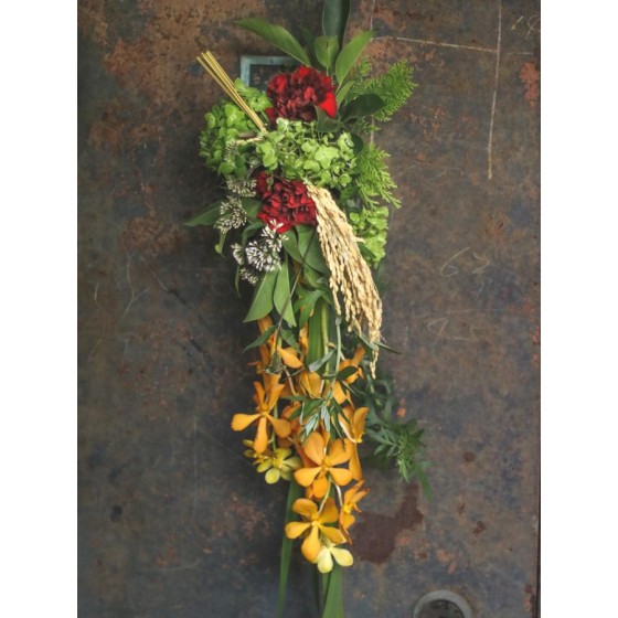 花 材:艾草、菖蒲、榕樹葉、芙蓉、繡球、康乃馨、千代蘭、當季葉材及配花