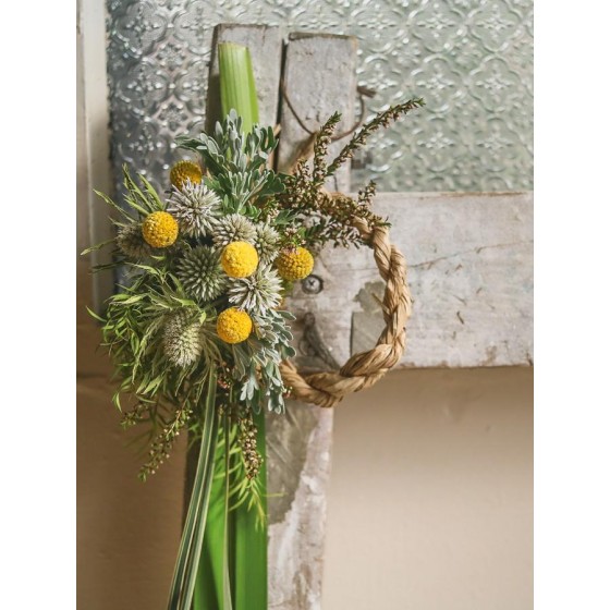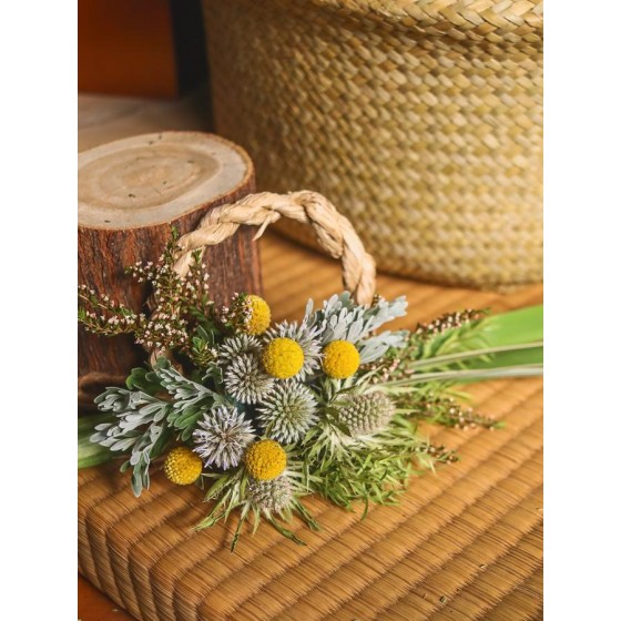 花 材:艾草、菖蒲、芙蓉、榕樹葉、金杖球、山防風、當季葉材及配花