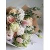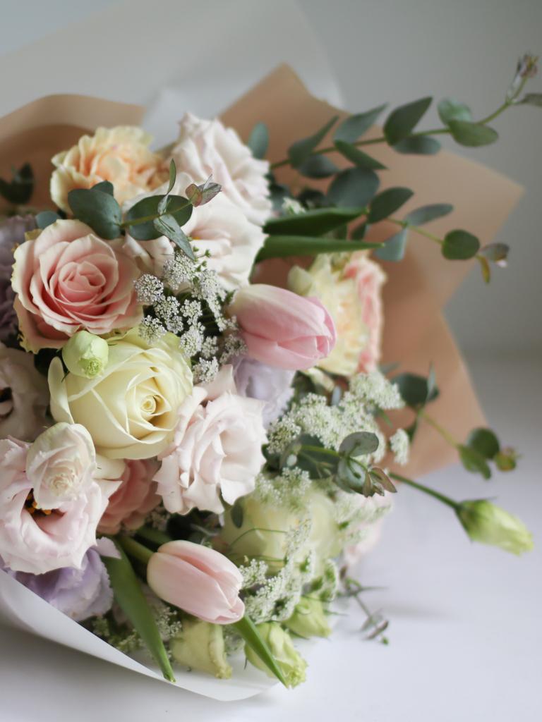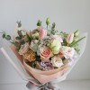 花 材:玫瑰、鬱金香、桔梗、蕾絲花、當季葉材