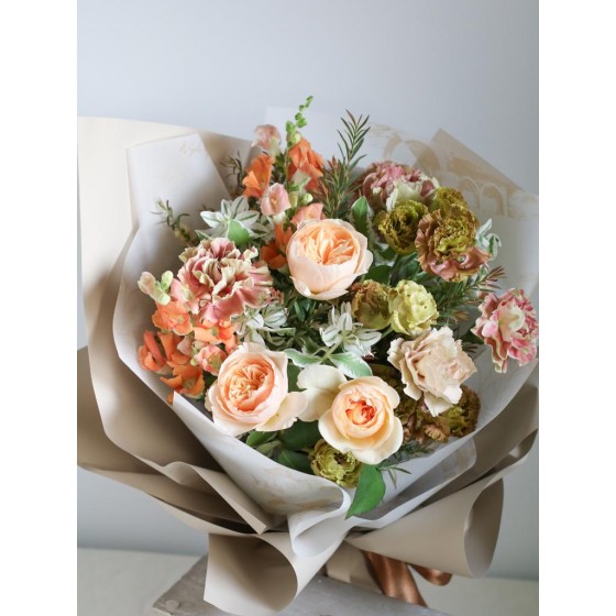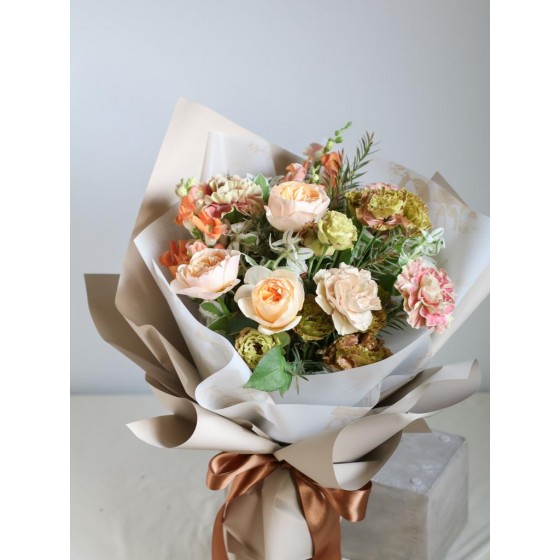 花 材:庭園玫瑰、進口康乃馨、復古桔梗、當季葉材及配花
