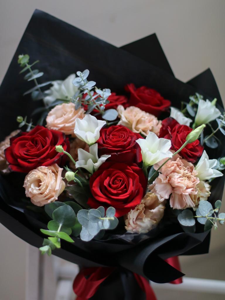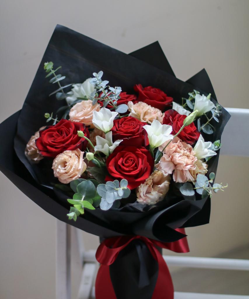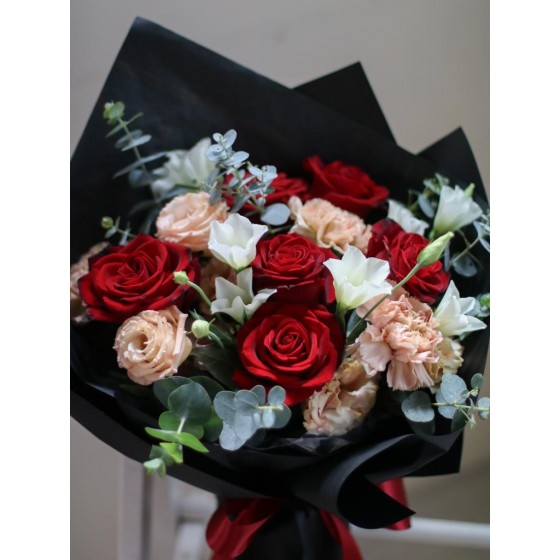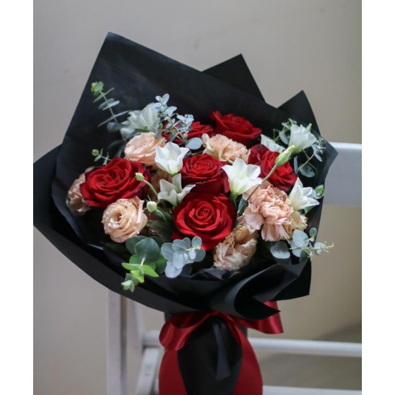 花 材:玫瑰、桔梗、進口康乃馨、當季葉材及配花